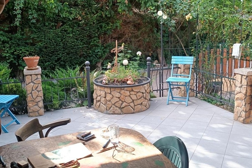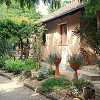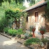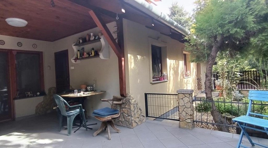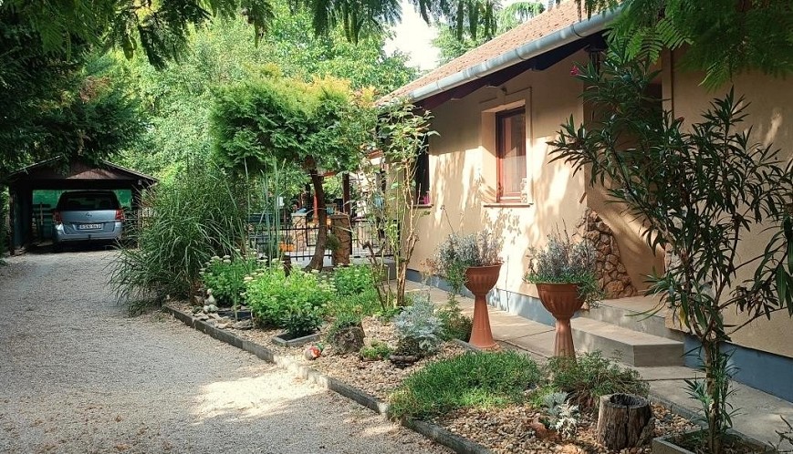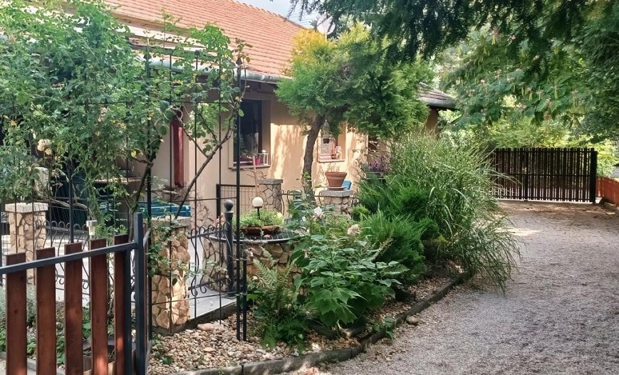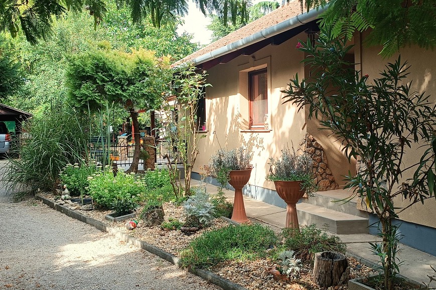 A ház körüli árnyas, parkosított kertben kavicsos sétány, dús növényzet, formás cserjék, magas fák és apró virágágyások nyújtanak természetes szépséget. A kert hangulatos pontjait egy nyári konyha és egy kellemes, fedett pagoda teszi teljessé, mely ideális egy nyugodt kávéhoz, grillezéshez vagy akár befőzéshez is. A gondosan kialakított konyhakert locsolása fúrt kútról egyszerűen megoldható. Az udvarban fedett autóbeálló és igényesen kialakított kocsibehajtó szolgálja még a mindennapi kényelmet.